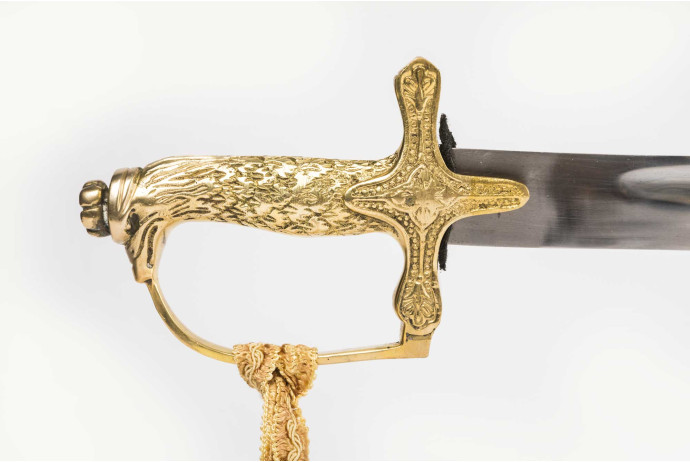 Duże tablo do wyeksponowania replik szabli polskich. Zestaw zawiera dwa uchwyty do mocowania replik. Tablo wykonane ze sklejki drewnianej koloru brązowego.