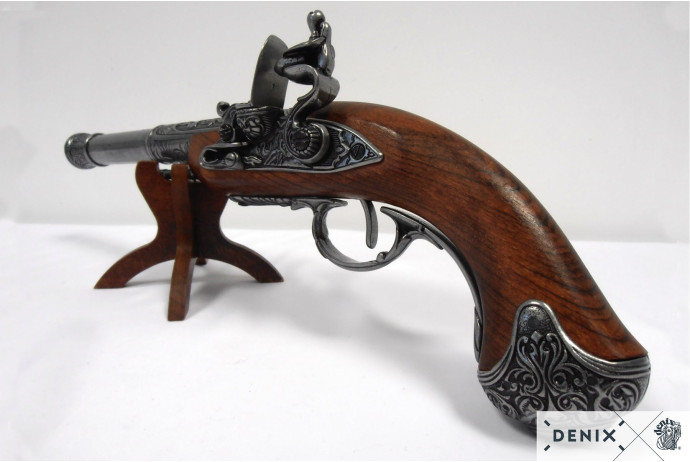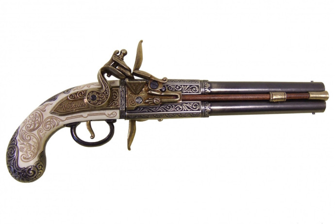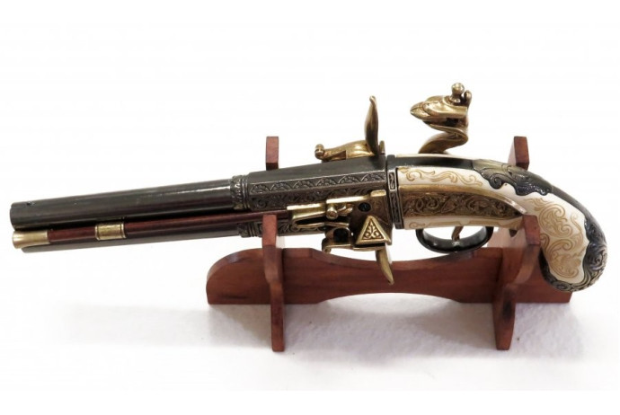 Wierna replika NA STOJAKU angielskiego pistoletu z 1750 roku. Wykonana z metalu i drewna. Metalowe wykończenia odlane z misternymi zdobieniami charakterystycznymi dla epoki. Pistolet dwustrzałowy, lufy obrotowe umieszczane jedna nad drugą. Mechanizm wyposażony w ruchomy spust oraz kurek pozwala oddać suchy strzał.