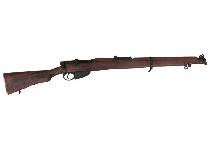 Wierna replika angielskiego karabinu Lee Enfield NA TABLO, używanego podczas II Wojny Światowej. Prezentowany model posiada zdejmowany magazynek, oraz działający zamek czterotaktowy. Możliwe jest również przeładowanie broni i oddanie suchego strzału. Cena zestawu zawiera: karabin, tablo i wieszaczki.