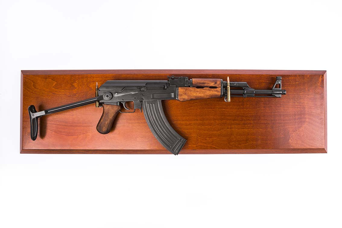 Wierna replika rosyjskiego karabinu maszynowego AK-47 NA TABLO. Prezentowany model posiada zdejmowany magazynek i rozkładana kolbę, możliwe jest również przeładowanie broni i oddanie suchego strzału. Cena zestawu zawiera: karabin, tablo i wieszaczki.