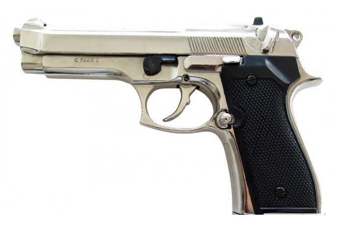 Replika podobna do oryginału znanego wszystkim włoskiego pistoletu BERETTA 92 z 1975 roku W PUDEŁKU. Klasyk. Kurek naciąga się można oddać tzw. suchy strzał. Wszystkie elementy funkcjonalnie ruchome, magazynek przeładowanie, zabezpieczenie, kurek. Po prawej stronie wytłoczony napis: MOD 92 F - CAL 9 Parabellum, po lewej numer C 7826 Z.