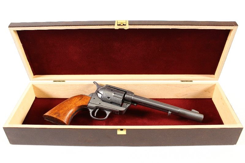 Replika W PUDEŁKU rewolweru kawalerii USA z 1876 roku, wykonana ze stopu ZnAlu, obicia rękojeści z bejcowanego drewna. Możliwość oddania tzw. suchego strzału. Colt posiada obrotowy bęben z sześcioma komorami nabojowymi. Bęben można obrócić bezpośrednio lub obracany jest przez mechanizm podczas napinania kurka. W replice tylna ściana oporowa została z jednej strony zaopatrzona w otwieraną do dołu pokrywę bębna. Pod lufą umieszczono działający prętowy rozładownik.