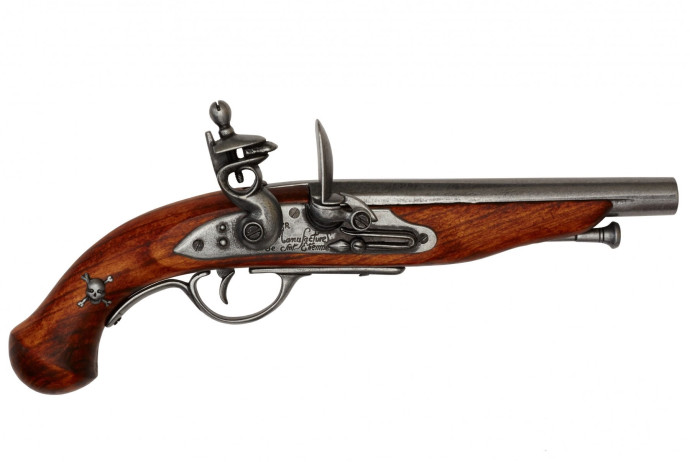 Wierna replika francuskiego, pirackiego pistoletu z VIII wieku W PUDEŁKU. Wykonana z drewna i metalu - stopu cynku z aluminium. Wykończona elementami metalowymi w kolorze stali. Kolba precyzyjnie zaokrąglona w drewnie na boku insygnia pirackie „trupia czaszka”. Pod lufą widoczny wycior, zamontowany na stałe. Mechanizm zamka ruchomy. Po naciągnięciu kurka, można oddać tzw. suchy strzał. Cena zawiera: pistolet i pudełko.