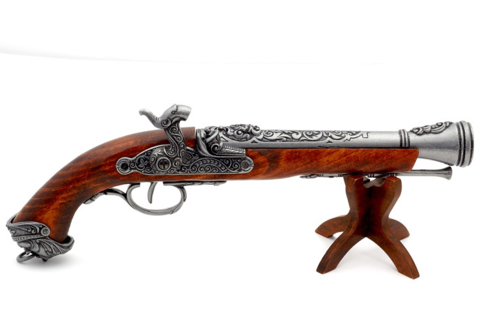 Replika włoskiego pistoletu skałkowego z XVIII wieku W PUDEŁKU. Pięknie inkrustowana lufa z lekko rozszerzanym wylotem pozwalającym w oryginale na powiększenie pola rażenia. Broń idealna w walce przy małych odległościach. Zwraca na siebie uwagę misternie wykonanym mechanizmem spustowym, oraz ornamentem na końcu rękojeści. Mechanizm spustowy można odciągnąć i oddać suchy strzał.