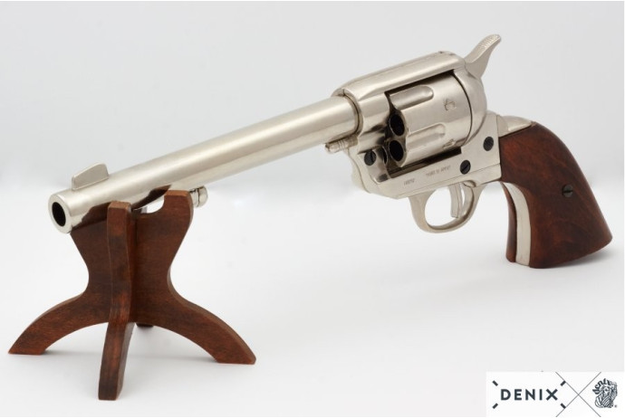 Replika W PUDEŁKU rewolweru kawalerii USA z 1876 roku, wykonana ze stopu ZnAlu, obicia rękojeści z bejcowanego drewna. Możliwość oddania tzw. suchego strzału. Colt posiada obrotowy bęben z sześcioma komorami nabojowymi. Bęben można obrócić bezpośrednio lub obracany jest przez mechanizm podczas napinania kurka. W replice tylna ściana oporowa została z jednej strony zaopatrzona w otwieraną do dołu pokrywę bębna. Pod lufą umieszczono działający prętowy rozładownik.