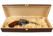 Replika W PUDEŁKU REWOLWERU PEACEMAKER z 1873 roku S.COLT USA wykonana ze ZnAlu, obicia rękojeści z bejcowanego drewna. Możliwość oddania tzw. suchego strzału. Colt posiada obrotowy bęben z sześcioma komorami nabojowymi . Bęben można obrócić bezpośrednio - odciągając kurek do pozycji pół naciągniętej lub obracany jest automatycznie przez mechanizm podczas napinania kurka do pozycji pełnej. W replice tylna ściana oporowa została z jednej strony zaopatrzona w otwieraną do dołu pokrywę bębna , umożliwiającą załadunek i rozładunek. Pod lufą umieszczono działający prętowy rozładownik - wybijak łusek, przechodzący przez komory bębna. Cena zawiera: pistolet i pudełko.
