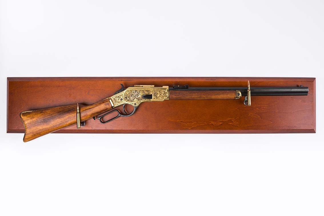 Replika słynnego Winchestera ‘73’ NA TABLO. Prezentowana replika bardzo dokładnie odzwierciedla oryginał. Metalowe części obudowy zamka zdobią ornamenty z epoki. Całość wykonano z dobrego gatunku drewna i zmatowionego cynkalu. Elementy mechanizmu są ruchome - umożliwiają np. oddanie suchego strzału. Jako ciekawostkę powiemy iż od 1873 roku Winchester wyprodukował model M1873 z zapłonem centralnym. W związku z wycofaniem z produkcji wieszaczków o symbolu 030 zostały zamienione na 028, zdjęcia nowych uchwytów w załączeniu. Cena zestawu zawiera: strzelbę, tablo i wieszaczki